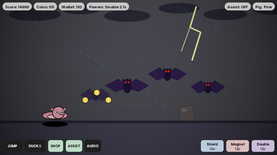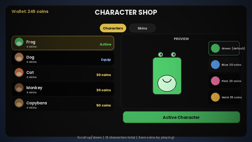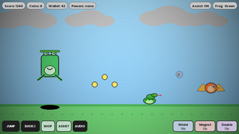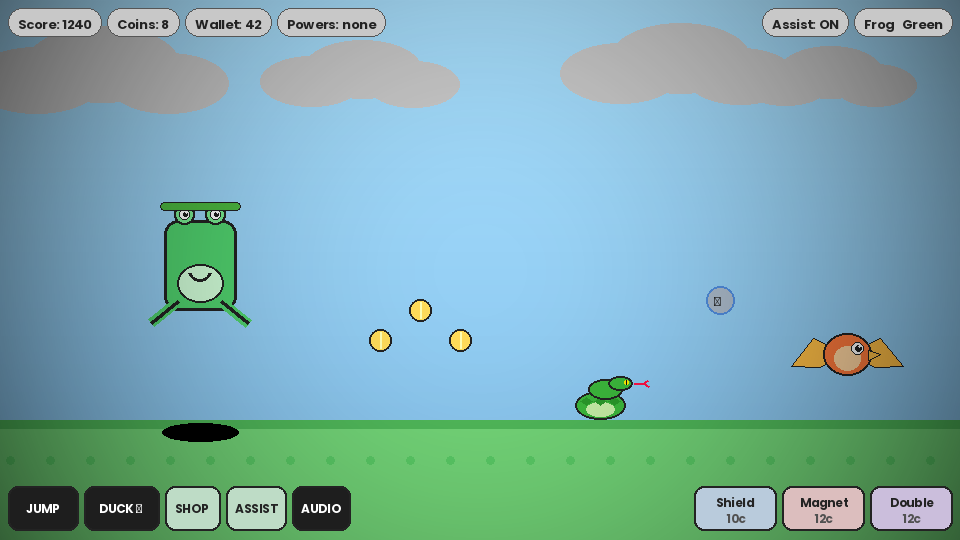 A cartoon endless runner starring a frog and unlockable animal characters. Built with HTML5 Canvas and Python (Pygame), featuring power-ups, a shop system, assist mode, and persistent progress.