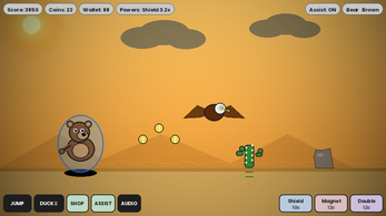 HOW TO PLAY: - Tap / Space / ↑ to jump (hold to charge a bigger jump) - Double-tap for a quick hop - Hold ↓ / S to duck under birds - Collect coins to unlock new characters and skins in the shop